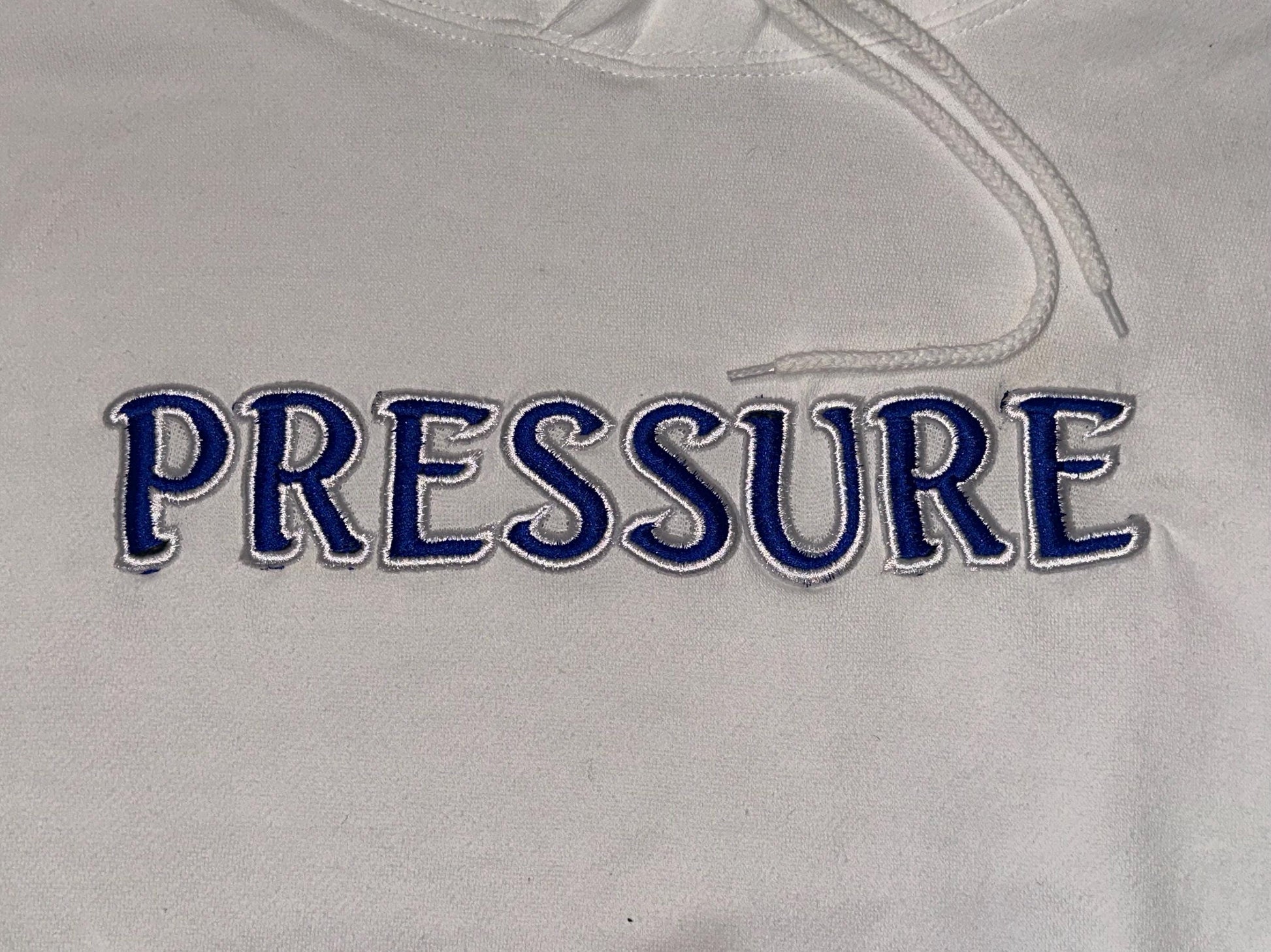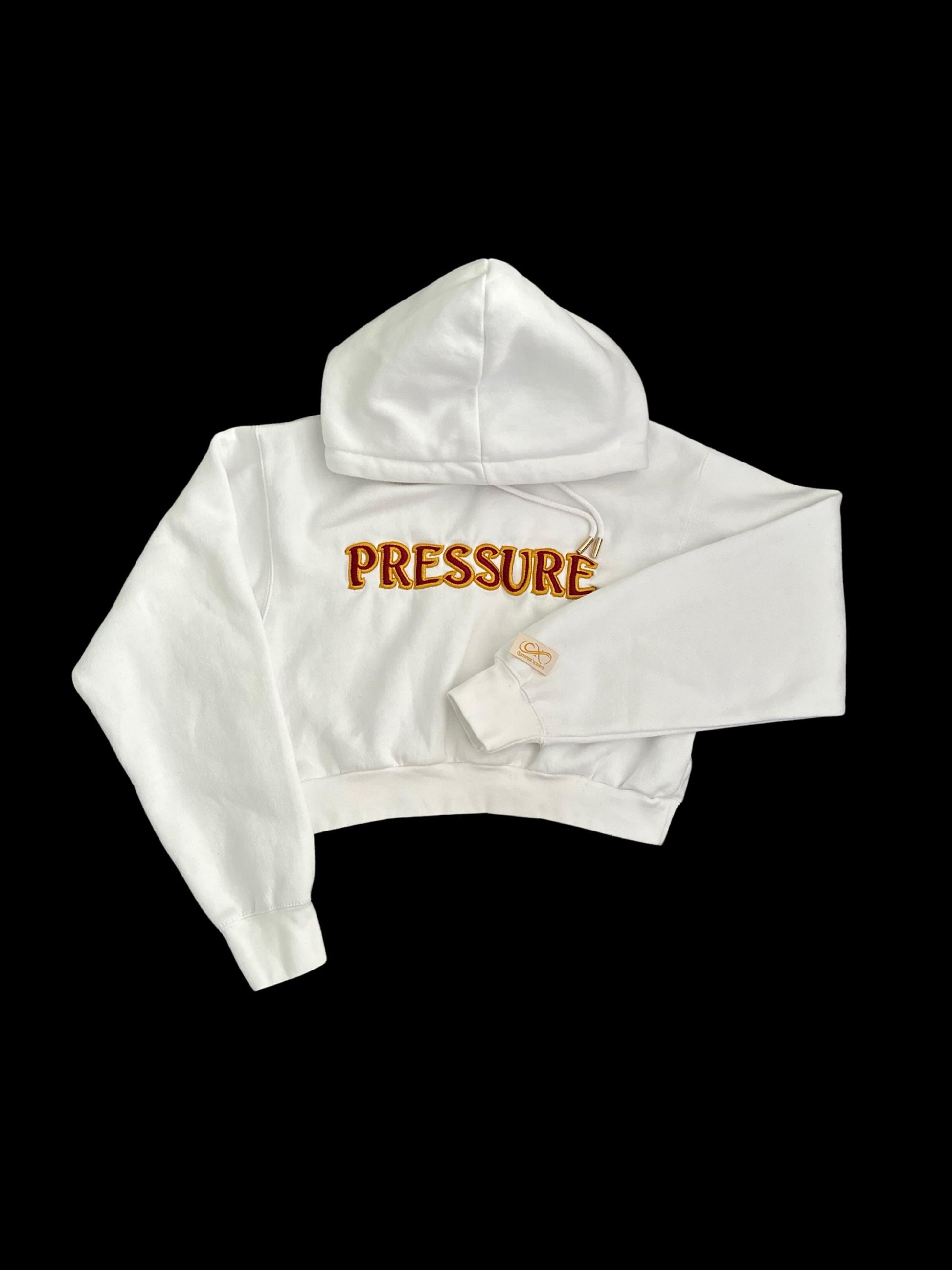 Each hoodie is embroidered with the word PRESSURE, creating a statement piece that’s easy to style and made to stand out. Custom drawstring tips add a refined detail not typically found on standard hoodies.