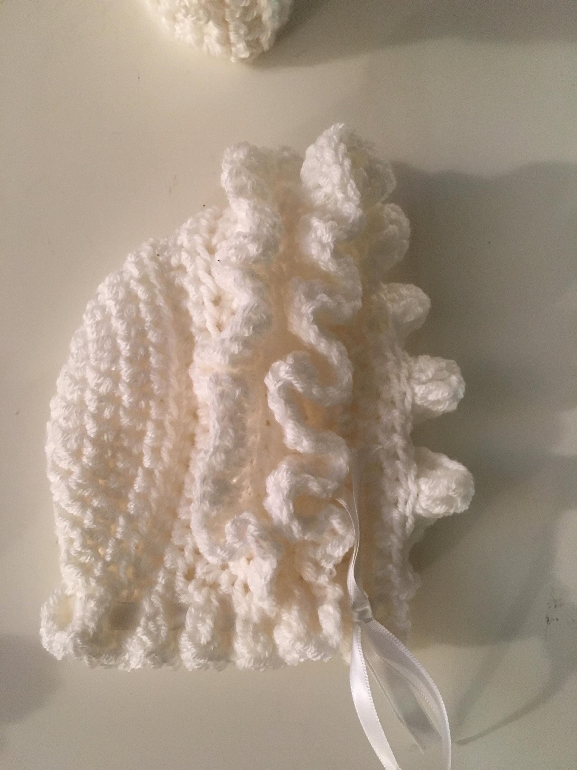 • Crocheted bonnet with ruffle detail and ribbon tie